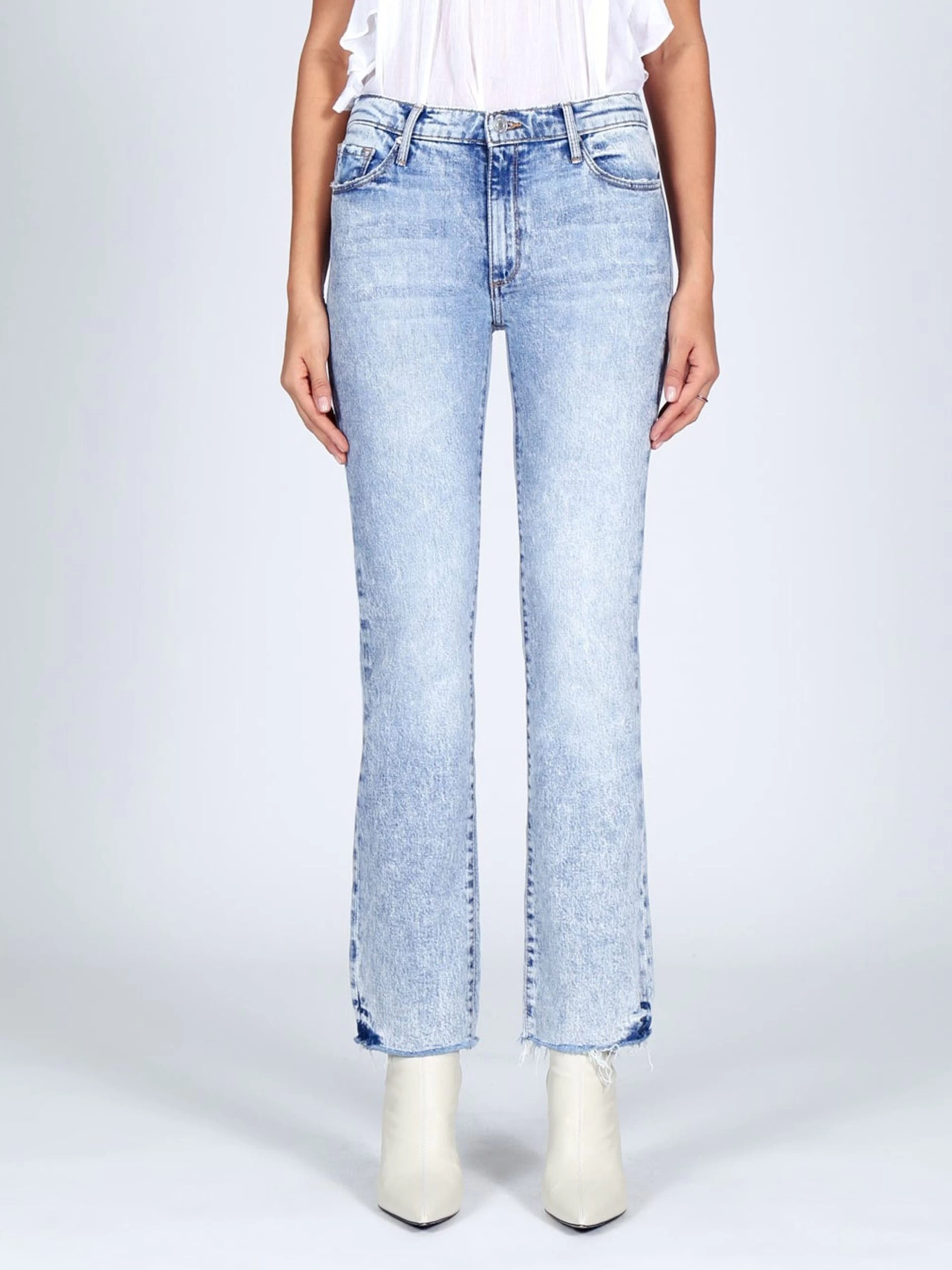 Best jeans you’ve ever had. Our Bardot Straight Fray has a slim straight leg fit with a 9-inch rise. The raw hem adds for an edgy, undone take. A vintage 80s slight acid wash light blue jeans