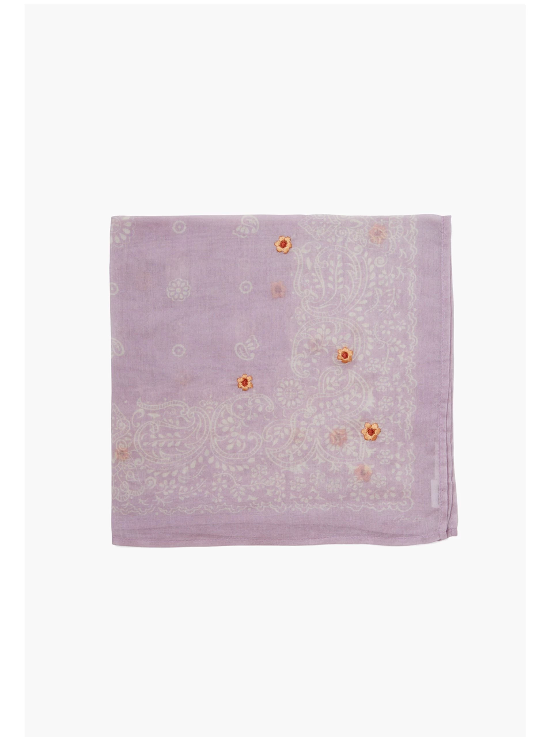 This viscose bandana features a classic print and floral embroidery against a lavender backdrop. A vibrant, versatile accessory.