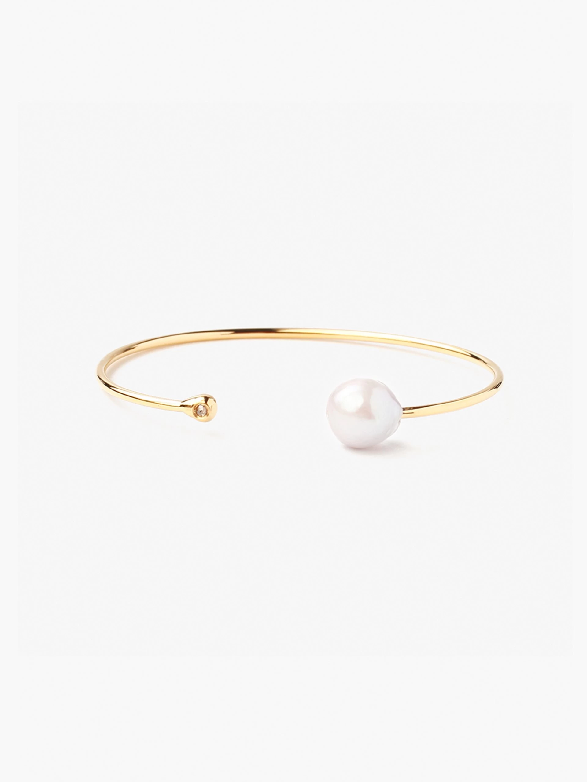 This sleek and classic cuff bracelet is composed of .03ct champagne diamond and an iridescent white freshwater pearl. Freshwater pearls are unique and one of a kind so sizes and shapes will vary.