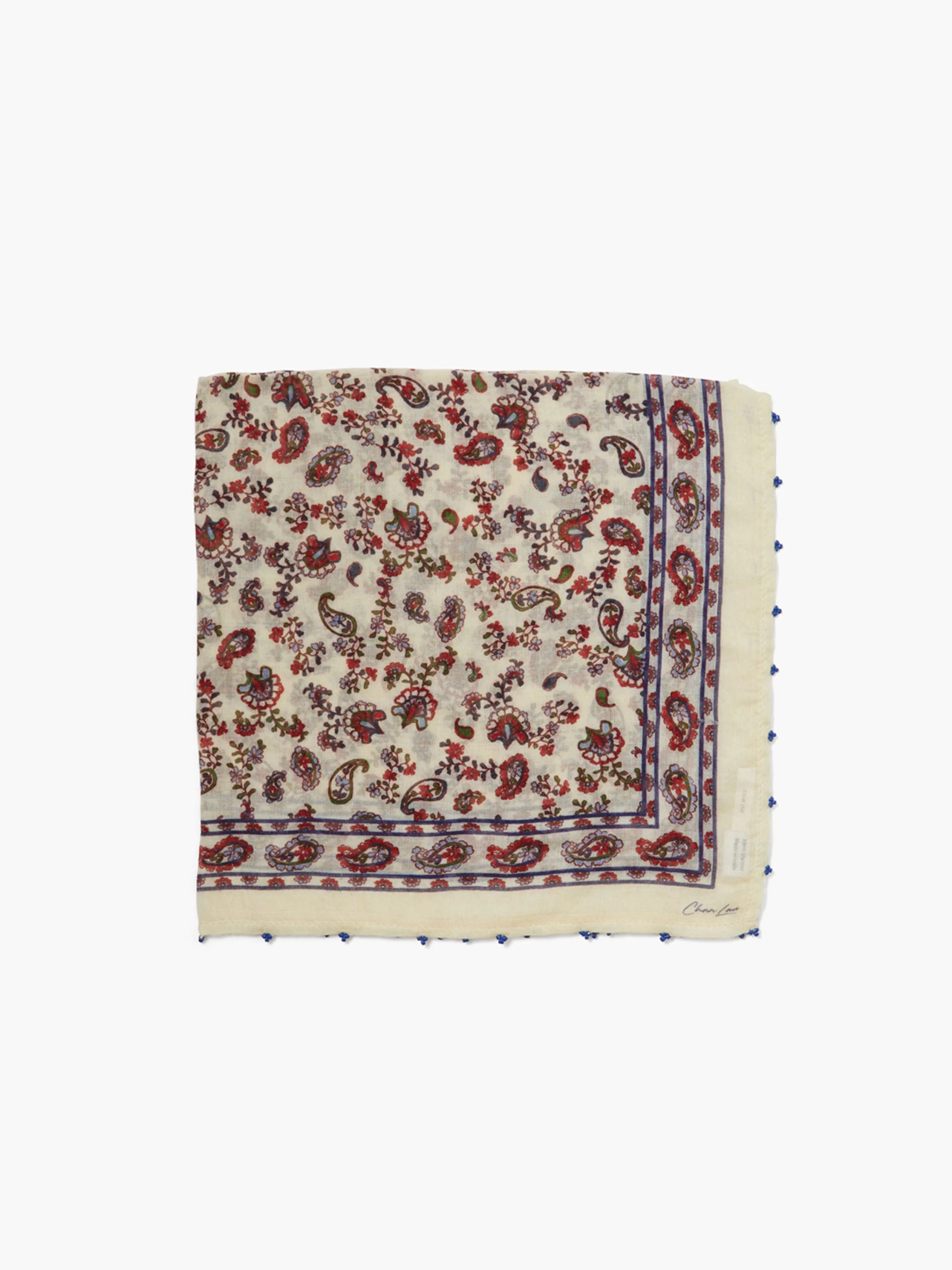 This viscose bandana features a paisley print and beaded trim against a fuchsia pink backdrop. A vibrant, versatile accessory.