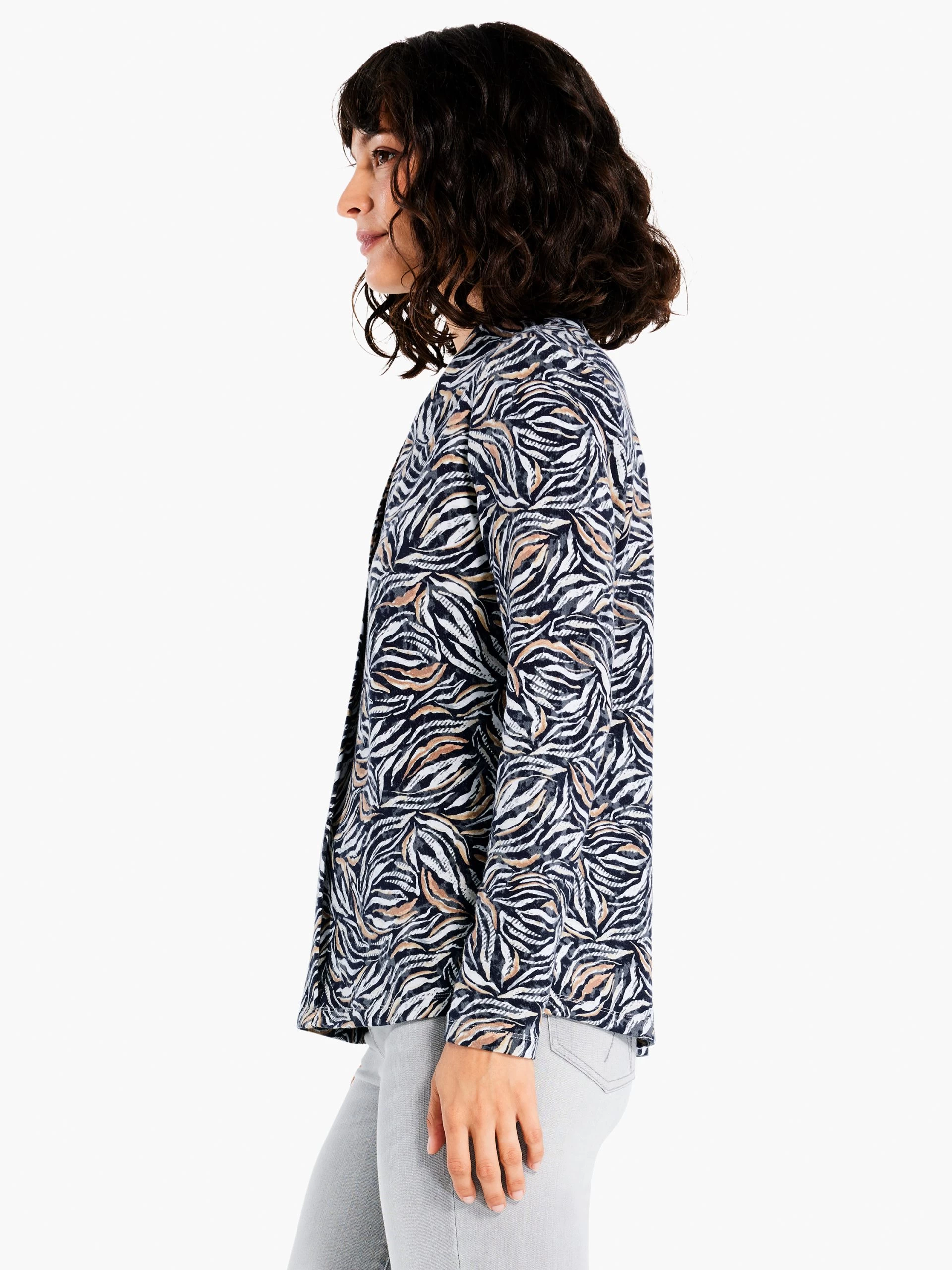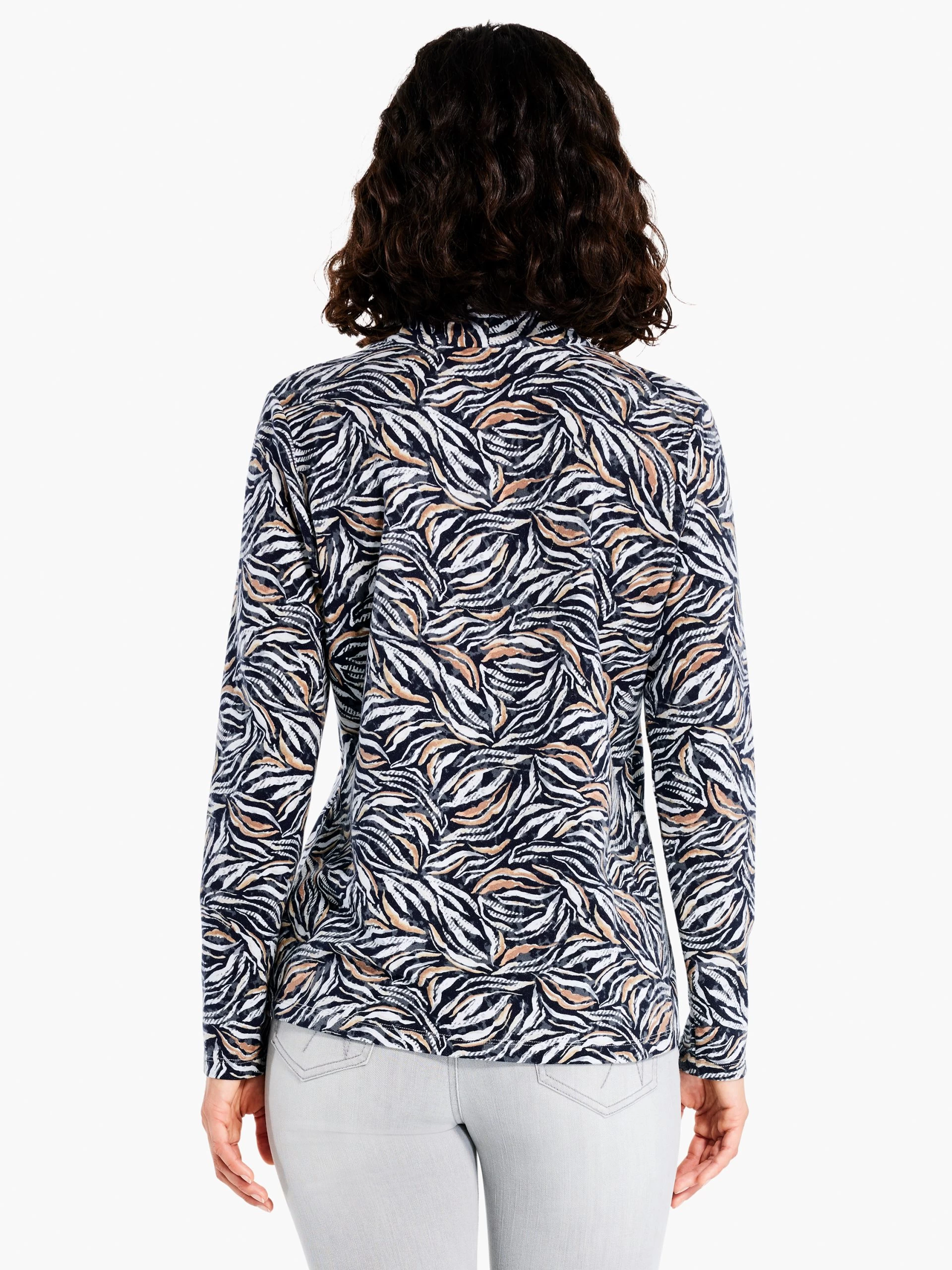 The fun of a natural print meets the sophistication and four-season versatility of elevated neutral tones. Made on a fabulously comfortable new cotton span French terry construction that you’ll reach for first. Midweight and with a regular fitting long-sleeved silhouette and a distinctive V-neck to add more shape. The hem sits at the hip.