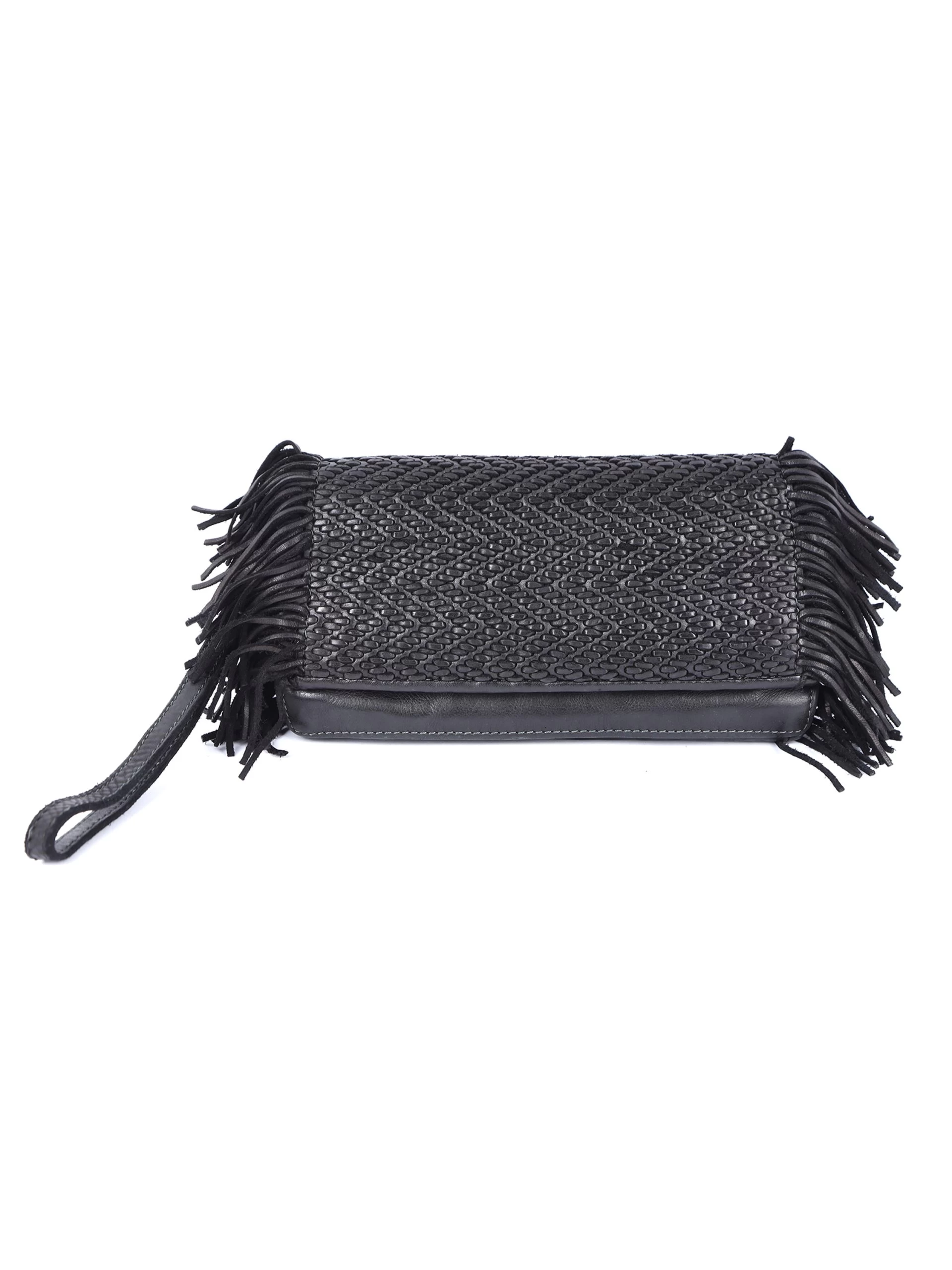 It’s hard to let go of this elegant wristlet, but that’s the point. A slim profile, organized interior, and gorgeous high-design feel elevate this wallet from the everyday to a must-have fashion accessory. Features include a secure closure, unique woven herringbone design, hidden magnetic snap closure, fringe details, and a detachable wrist strap.