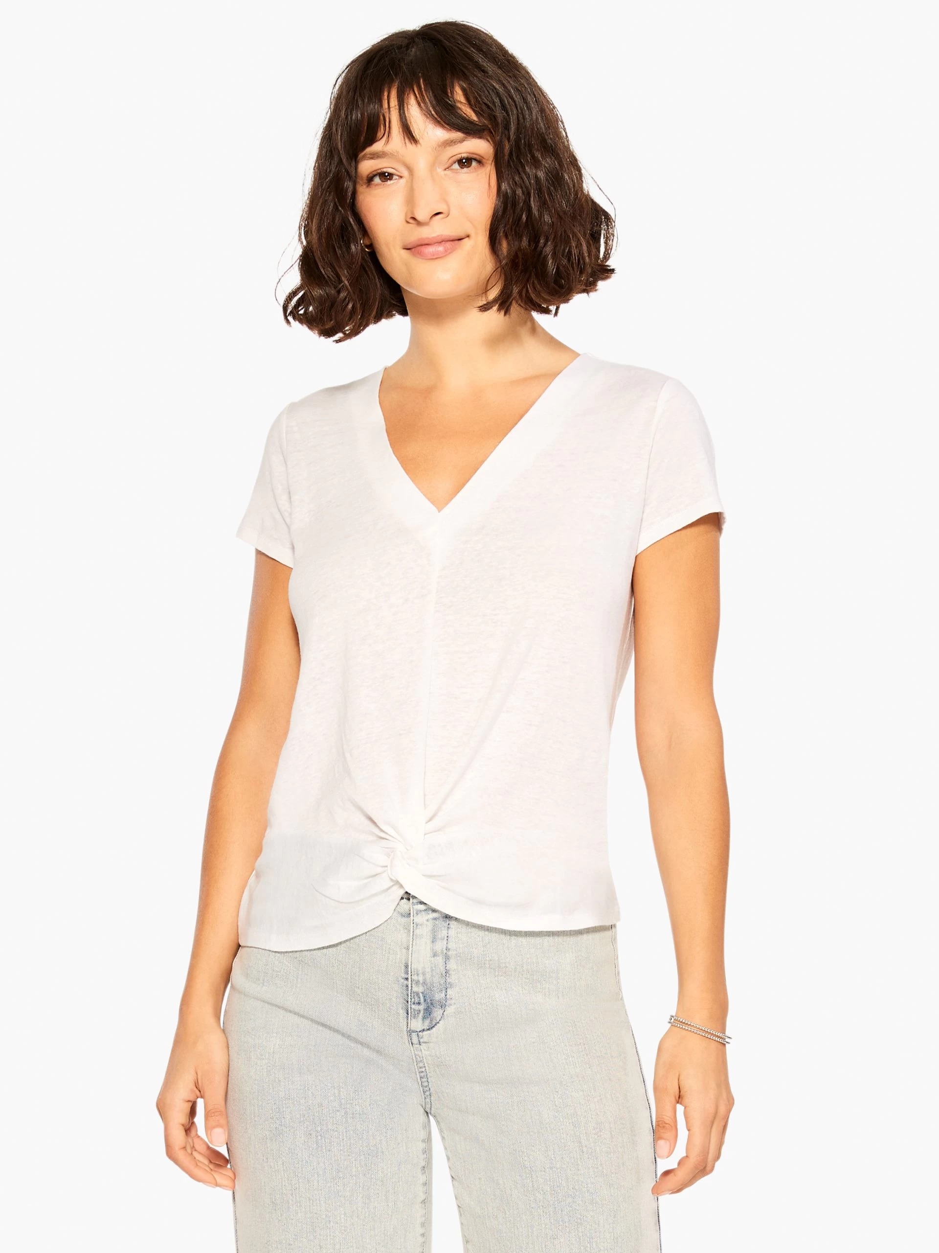 Why knot? Why not!? Every T-shirt drawer needs a wildcard. Made from a modern linen blend that’s surprisingly drapey and comfortable while keeping the material’s distinctive breathability. With standard short sleeves a generous V-neck that adds additional distinction to the shape. The hem is designed to sit at the hip. Wear it with easy, open layers to show off the texture.