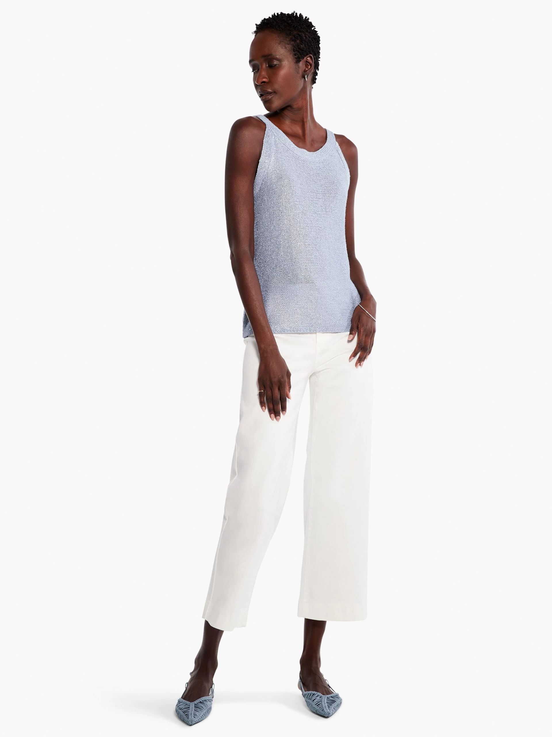 An easy anytime tank that gives your next look both texture and shine. Pair it with the matching cardigan or layer away and make it your own. Made with a more fitted silhouette, a round neck, and a hem that sits at the hip. Mindfully Made from fully fashioned knitwear that eliminates textile waste.