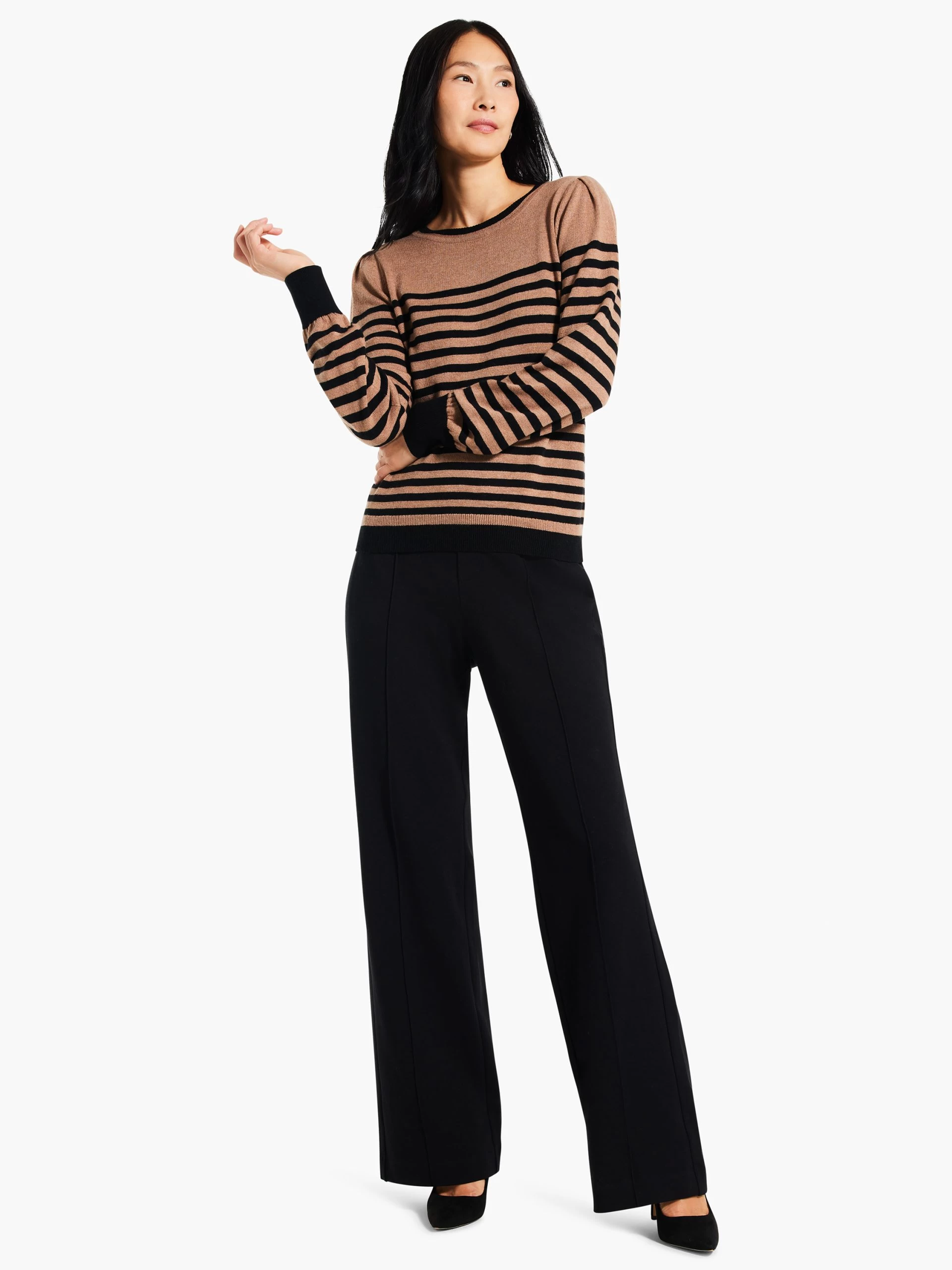 Our fan-favorite Femme Sleeve silhouette has officially arrived in patterns. The horizontal stripes (including the placed stripe at the collar) give it a versatile, eye-catching, and completely classic look. The silo is an easy pullover with a pleat detail at the top of the sleeve and a generous cuff to add even more shape. Mindfully Made with “no waste” knitwear.